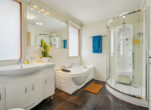 The main living area is warm and inviting, featuring beautiful lime washed American red oak boards and a neutral palette. The open-plan kitchen, dining and lounge area all make the most of the lovely water outlook. There is a convenient powder room near the front entrance, and the sense of light and space throughout adds to the home’s relaxed feel.