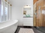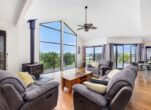 The neat and tidy kitchen, complete with an island bench, overlooks the living and dining zones, ensuring the cook is always part of the conversation. Accommodation is generous, with four well-proportioned bedrooms, including a stunning master retreat. The ensuite bathroom features a bathtub positioned to capture scenic views, offering a serene space to unwind and relax.