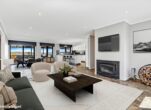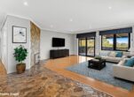 Inside, the expansive open-plan kitchen, dining, and sitting area forms the heart of the home, showcasing polished sandstone flooring, stainless steel benchtops, soft touch cabinetry, island bench, induction cooktop, Smeg pyrolytic oven, Fisher & Paykel double drawer dishwasher, and Westinghouse fridge. The kitchen is certainly a chef’s dream.