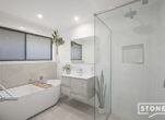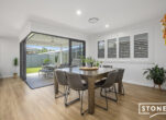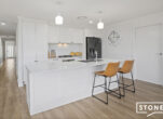 At the centre of the home is a beautifully appointed kitchen designed to impress, complete with engineered stone benchtops, soft-close cabinetry, a large island bench and quality stainless steel appliances including a gas cooktop and electric oven. The open-plan kitchen, dining and family areas flow seamlessly to the covered alfresco entertaining space via large glass stacking doors, creating the perfect setting for gatherings with family and friends.