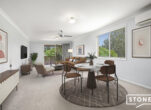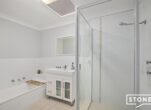 The open-plan living and dining area is bright and inviting, complemented by ceiling fans and air conditioning for year-round comfort. A modern bathroom includes a bathtub, shower, and vanity, while the generous laundry offers plenty of storage space along with the convenience of an additional toilet.